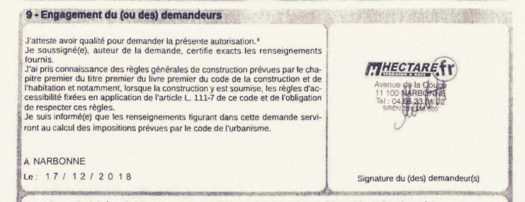 Le 17 décembre 2018, alors qu’aucun accord n’a été trouvé, la société Hectare remplit le formulaire de demande de permis d’aménager pour le projet « La Corbière Haute ». Arrivé au cadre 9, le représentant de la société atteste qu’il a l’autorisation des propriétaires. Et il signe.